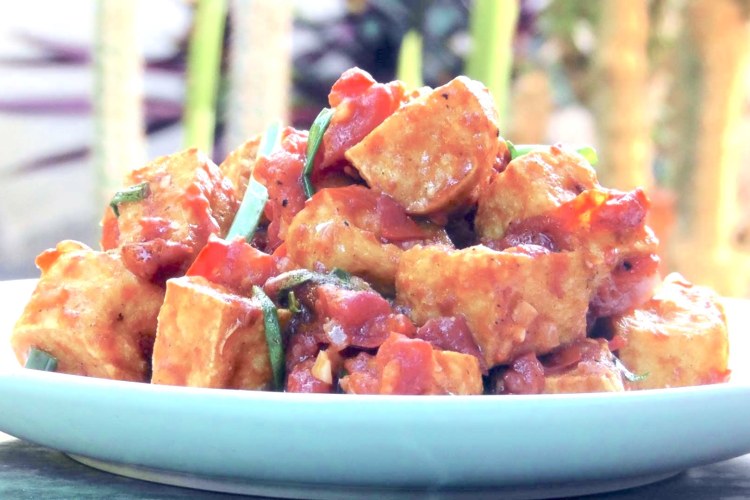 This tofu braised in a spicy sauce and pan fried with caramelised onion, garlic and spring onions. The is is juicy, a little spicy, crispy on the outside and soft on the inside. It’s a delicious side dish for rice, noodles or porridge, and tastes meaty even though it’s a totally vegetarian dish.