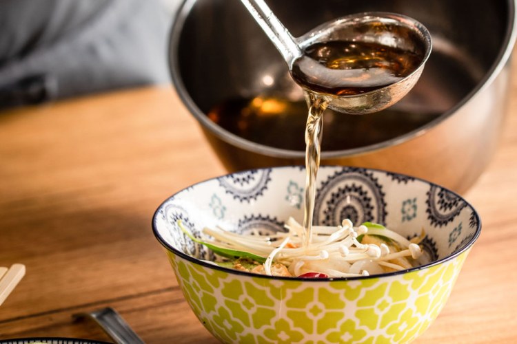 Garnish with the sliced chilli, coriander, Thai basil, lemon wedges, a Vietnamese baguette or ramen noodles.