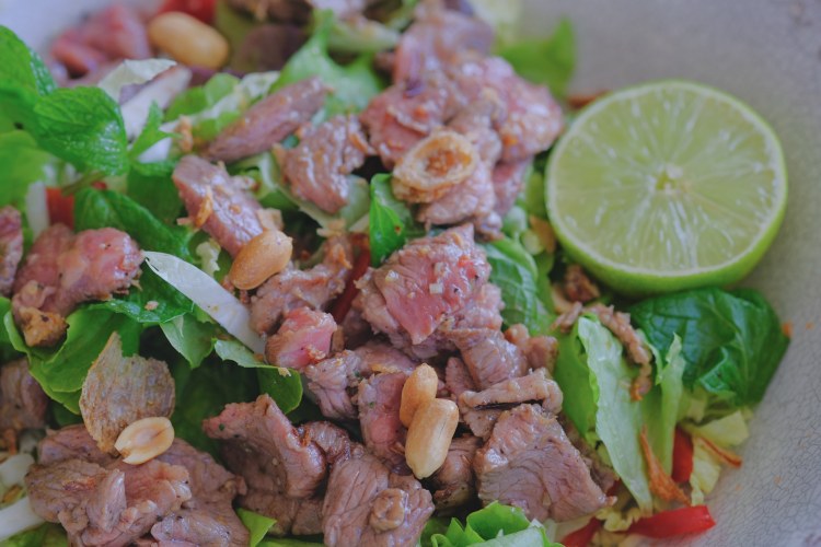This warm Thai style beef salad is an ideal way to clean out the vegetable crisper. It makes a light and zippy entree but is also substantial enough to serve as a main course.