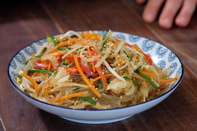 Originally designed for the royal Korean court, this dish boasts a variety of colours and textures. This recipe is really flexible with choice of vegetables, however the concept is to cut everything into even strips. If you cannot find garlic chives, substitute thinly sliced spring onion or regular chives.
